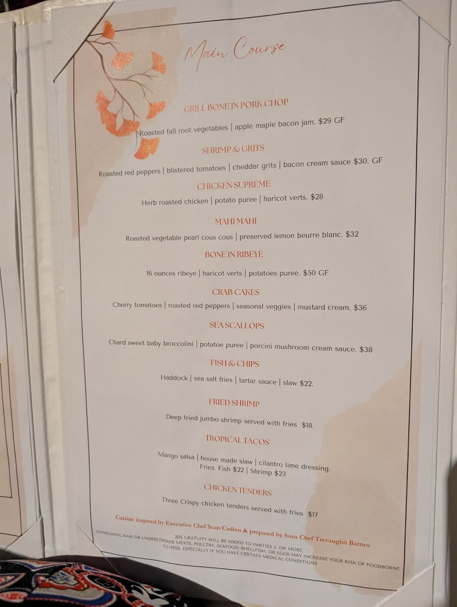Grilled mahi set over a silky brown butter butternut squash purée, paired with autumn vegetables.
